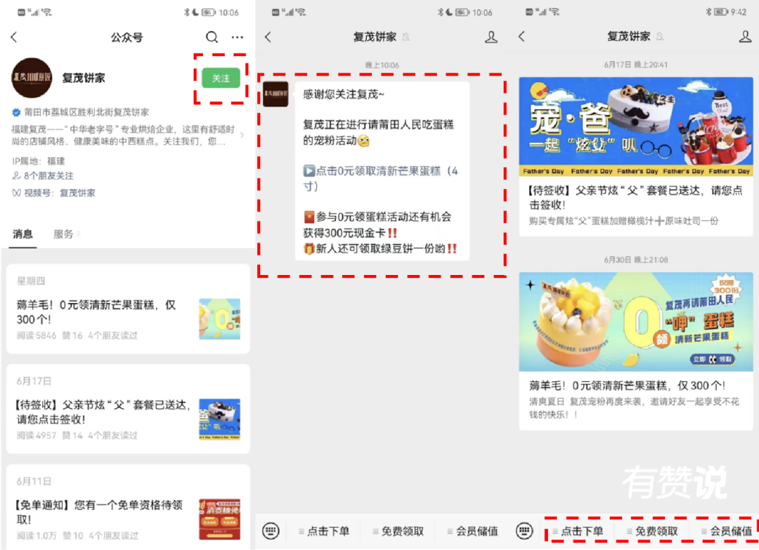 以复茂饼家为例,它的菜单做了引导消费者的设计,比如点击下单、免费领取、会员储值。
